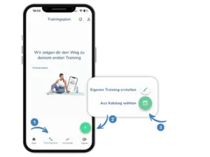 - Training wählen: Tippe auf das grüne Plus (+), um zum Trainingskatalog zu gelangen und wähle dein gewünschtes Training aus.